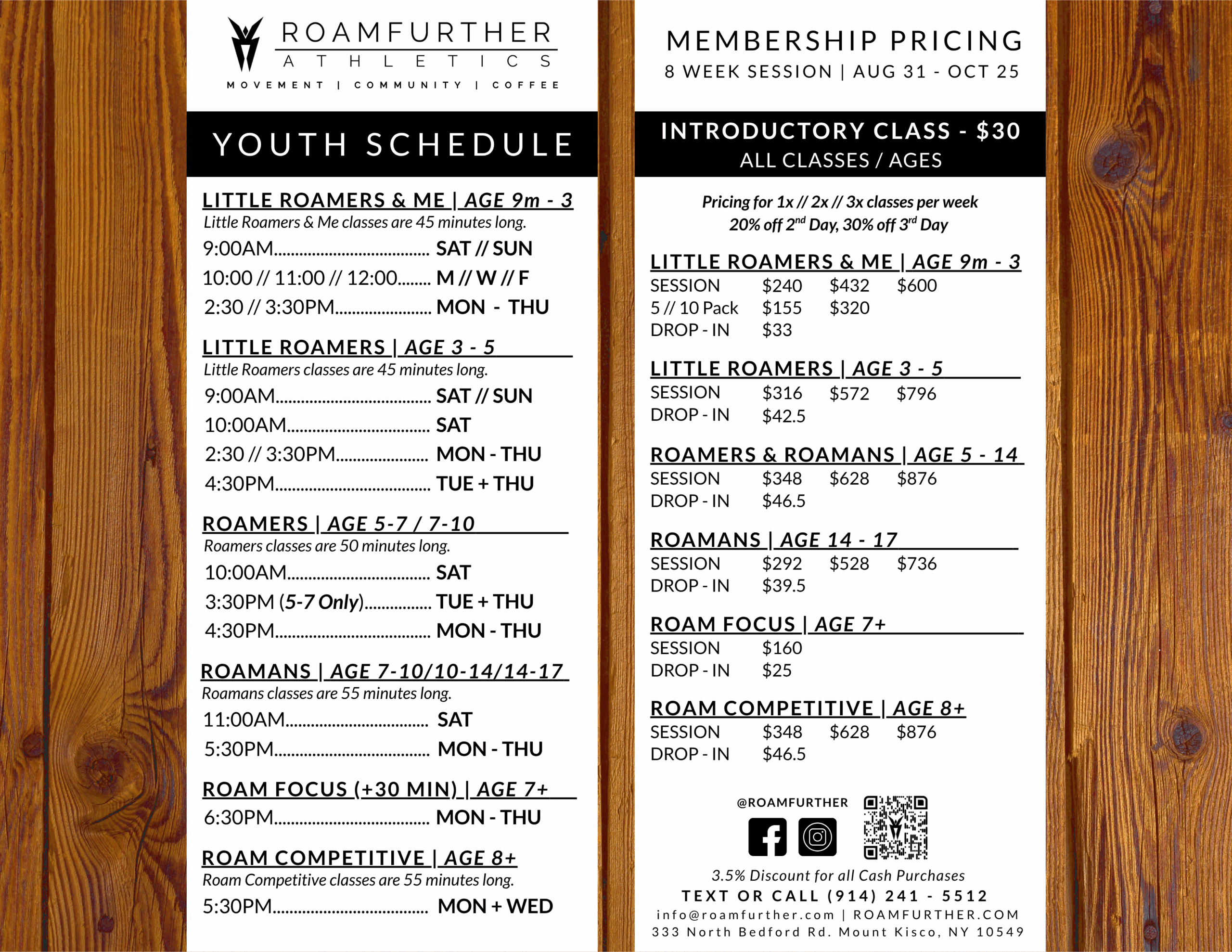 ROAMFurther offers classes for all ages beginning as young as 9 months. Classes run weekly Monday – Saturday on a cycle of repeating 8 week sessions during every season except Summer, which runs for 10 weeks.